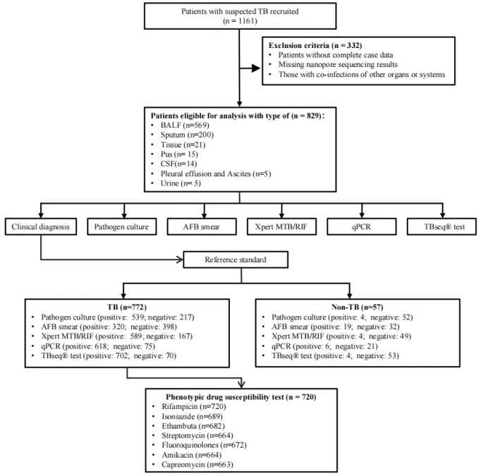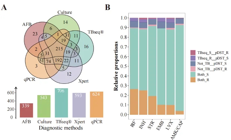 本研究招募了來自6家結(jié)核病定點(diǎn)醫(yī)院的1161例疑似結(jié)核病患者,經(jīng)篩選后納入829例進(jìn)行后續(xù)分析。通過對比M.tb培養(yǎng)、AFB涂片、Xpert MTB/RIF Ultra、qPCR及TBseq®五種診斷方法的性能,以臨床診斷為金標(biāo)準(zhǔn),評估其診斷準(zhǔn)確性。同時(shí),對720例結(jié)核患者進(jìn)行pDST,驗(yàn)證TBseq®在耐藥性預(yù)測中的表現(xiàn) (Figure 1)。