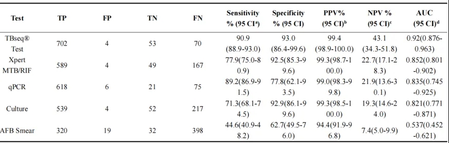 Table 1 不同檢測方法的結(jié)核病診斷性能